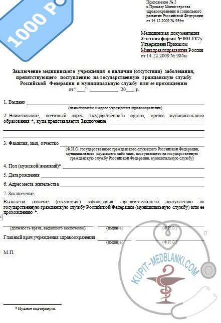 Медицинская справка 001 гсу для поступления на государственную службу действует на протяжении одного года. Выдается справка только при отсутствии у претендента на вакантное место следующих патологий: