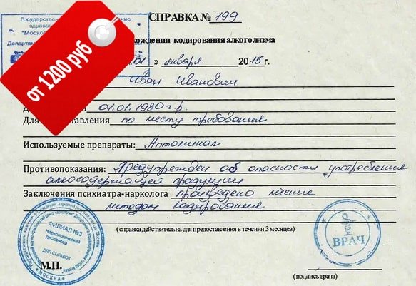 Купленный бланк будет заверен печатью и подписью врача поликлиники столицы. Кроме того, в нем будет указана информация о методе кодирования, используемом препарате и периоде действия данной процедуры.