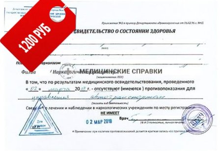 Поэтому мы предлагаем купить заключение из наркологического диспансера (НД) в Москве без обращения в медицинское учреждение. Это выгодно, быстро и совершенно не хлопотно. Покупка справок в Москве далеко не редкость, но самое главное, знать, к кому вы обращаетесь.