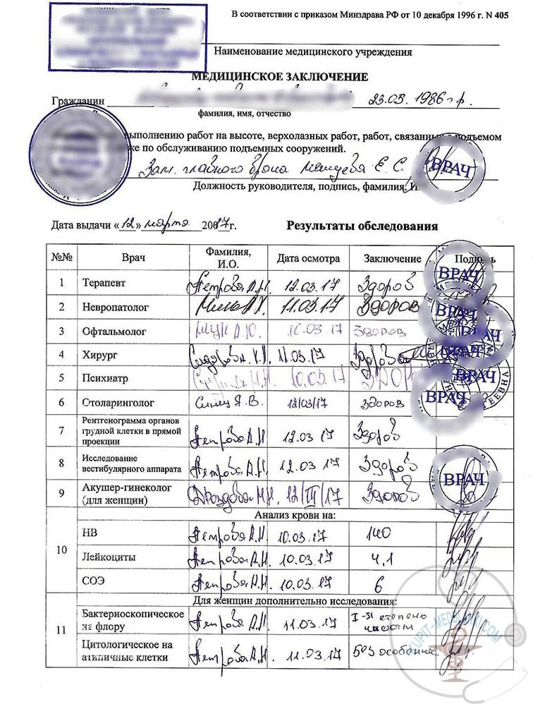 Купить справку для работы на высоте формы 405 вы можете в нашей организации. Мы давно занимаемся продажей медицинских документов, знаем все тонкости их оформления. Сделанные нами